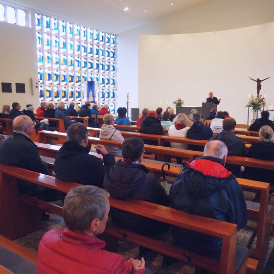 Von dort setzten wir, mit Regenschirmen gut versorgt, unseren Weg zur katholischen Corpus-Christi-Gemeinde in der Nordstraße fort. Pfarrer Stefan Reinecke nahm uns in Empfang und gab uns einen anschaulichen Einblick in die Besonderheiten des Gemeindelebens und vor allem auch in die Herausforderungen eines sehr großen Einzugsbereiches bei gleichzeitig begrenzter personeller Ausstattung.