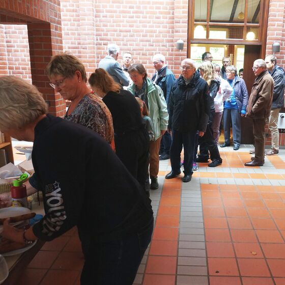 Dritte Station und Ziel des Rundgangs war die Evangelische Auferstehungsgemeinde, in der Pastor Peter Klindworth und ein Team der Gemeinde nicht nur mit einer Andacht und Informationen, sondern auch mit einem leckeren Buffet aus hausgemachtem Kartoffelsalat und verschiedenen Grillwurst-Sorten den Vormittag ausklingen ließen.