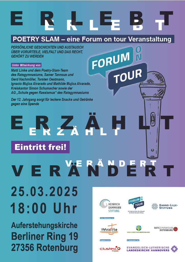 Im Rahmen der Veranstaltungsreihe „Forum on tour“ findet am 25.03. ab 18 Uhr in der Auferstehungskirche, in Rotenburg, ein Abend unter dem Titel „Erlebt, erzählt, verändert – Poetry Slam, persönliche Geschichten und Austausch über Vorurteile, Vielfalt und das Recht, gehört zu werden“ statt.